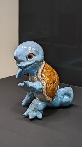 ポケットモンスター「赤と緑」の 御三家のひとり!?…ゼニガメです。 かわいいイメージなのですが、 陶器製のゼニガメは何やら一癖も二癖も ありそうな感じで、目が離せません。 もうひとつのゼニガメは、螺鈿。 シルエットがすべてを物語っているよう。 《…