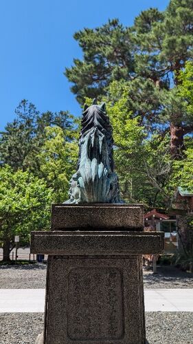 少し前の尾山神社、晴天。 ベンチ「山笑う」には梅の実が置かれていました。 前田利家公の上空には鮮やかな飛行機雲。 凛とした後ろ姿の狛犬様、カッコいいです。