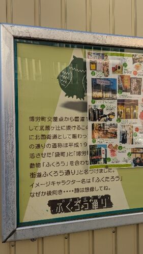 かなりの確率で袋町で降りるのに、 全然気づかなかったこの案内板。 わかりやすい地図、建物のイラストも特徴を すごく捉えてる! そして後ろ向きのふくろうがちらほら。 「博労町」プラス「袋町」プラス「ふくろう」で 「武蔵北国街道ふくろう通り」だそう…